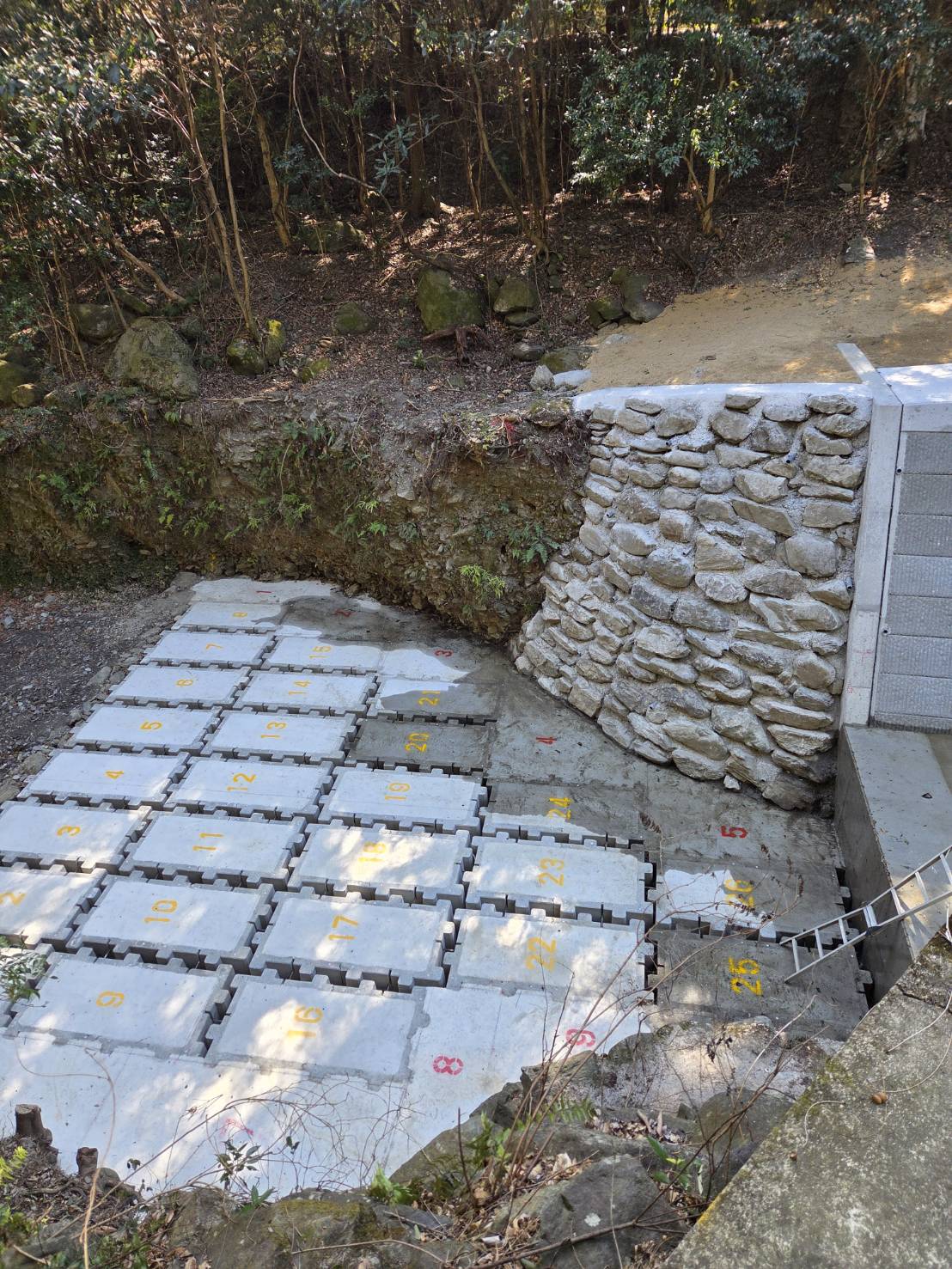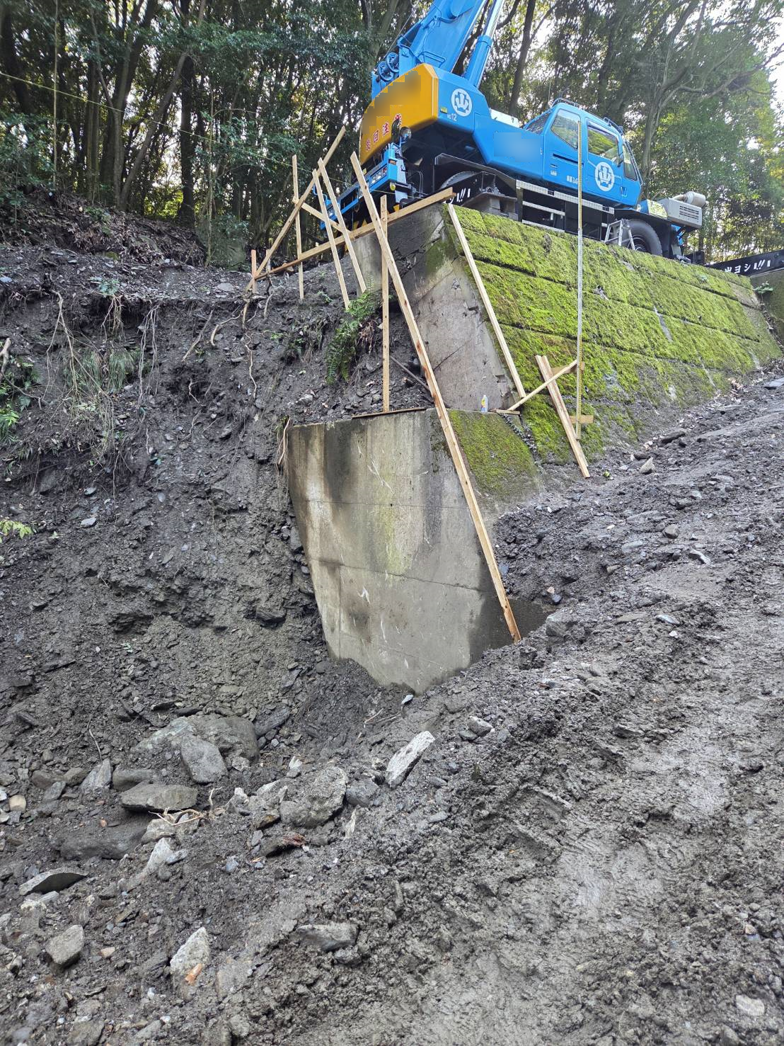 現地の状況を確認しながら、周辺環境や安全面に配慮しつつ、崩れていた箇所の補修・復旧を進めています。
